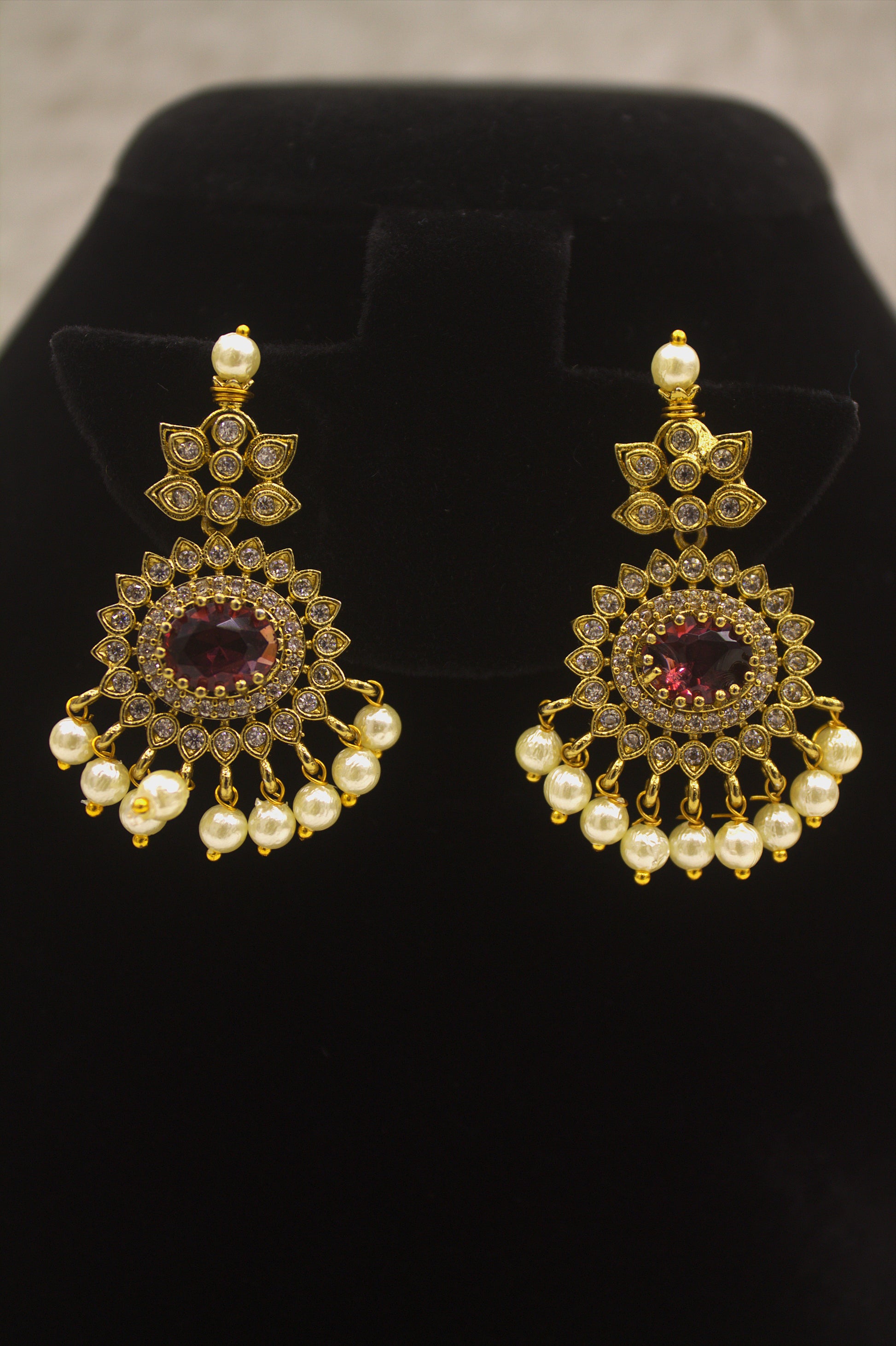 Bring timeless charm to your look with this stunning antique gold-finish pendant necklace and earring set, designed with a bold red centerpiece surrounded by sparkling stones and delicate pearl drops. The intricate craftsmanship and traditional detailing make this set an elegant choice for weddings, festive occasions, and cultural celebrations.