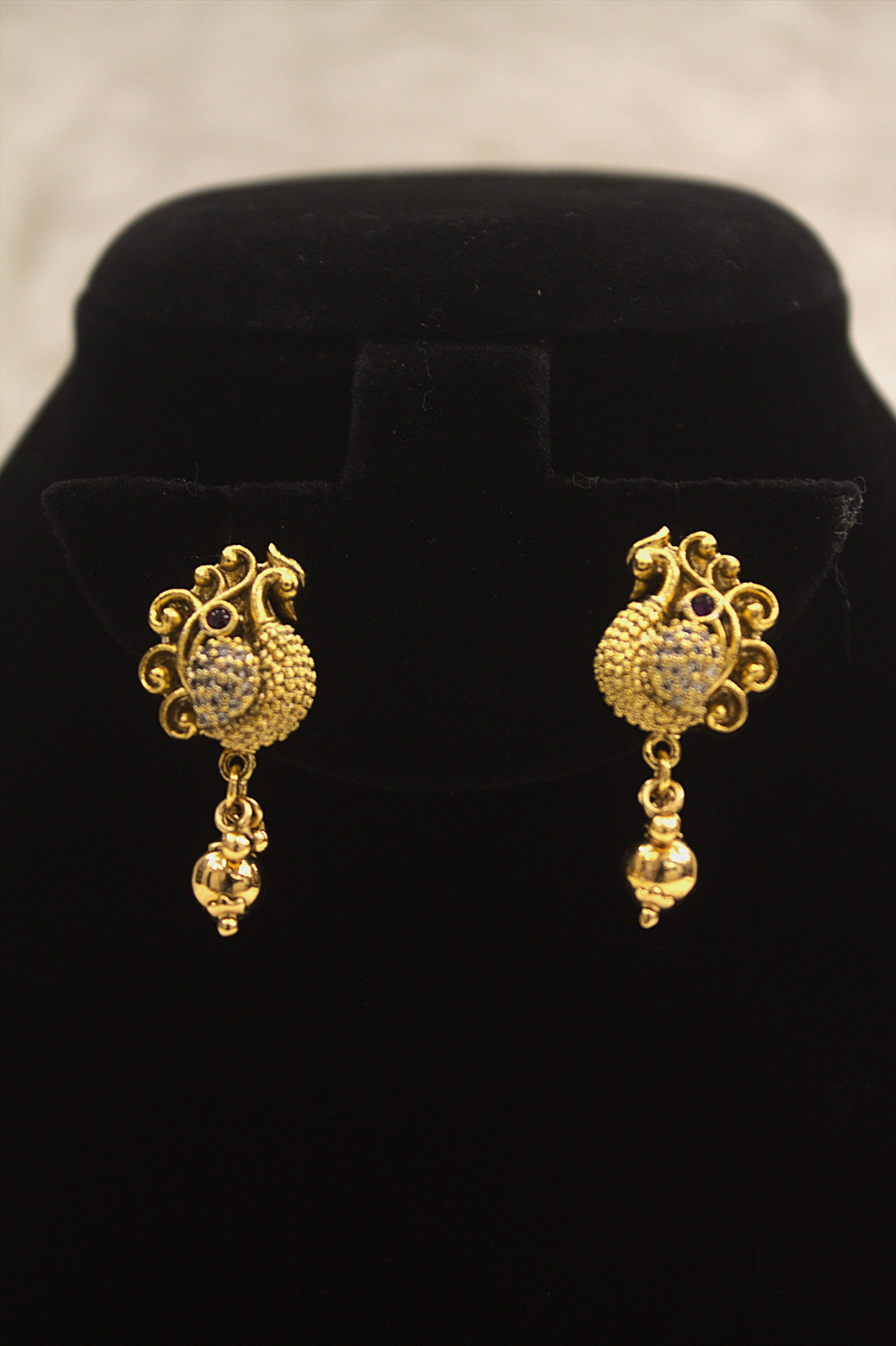 Step into timeless tradition with this exquisite gold-plated temple jewellery set, featuring an intricately crafted Lakshmi motif pendant paired with regal peacock-inspired designs. Embellished with fine detailing and adorned with delicate hanging drops, this set radiates divine elegance — making it the perfect choice for weddings, festive occasions, and cultural celebrations.
