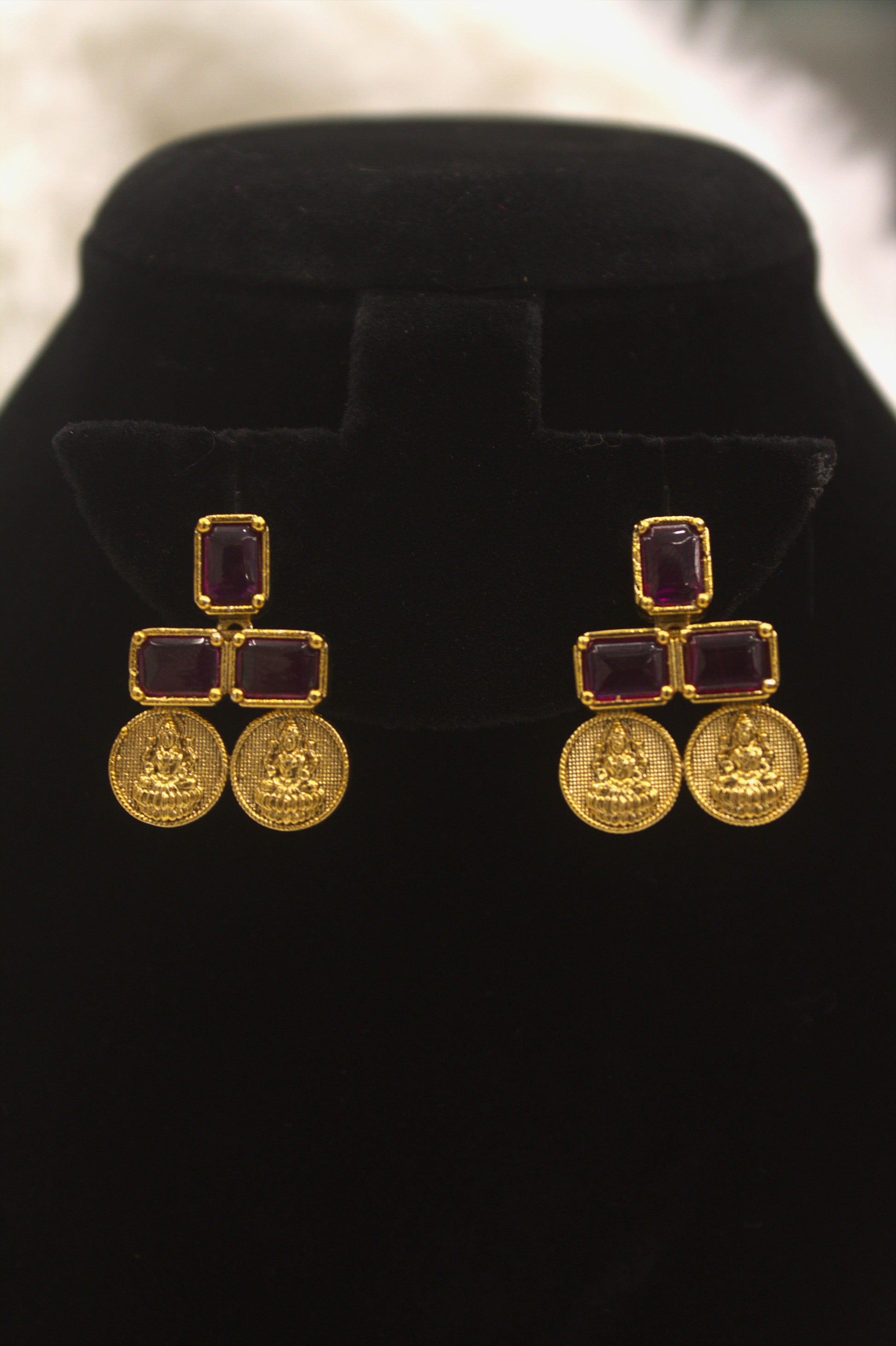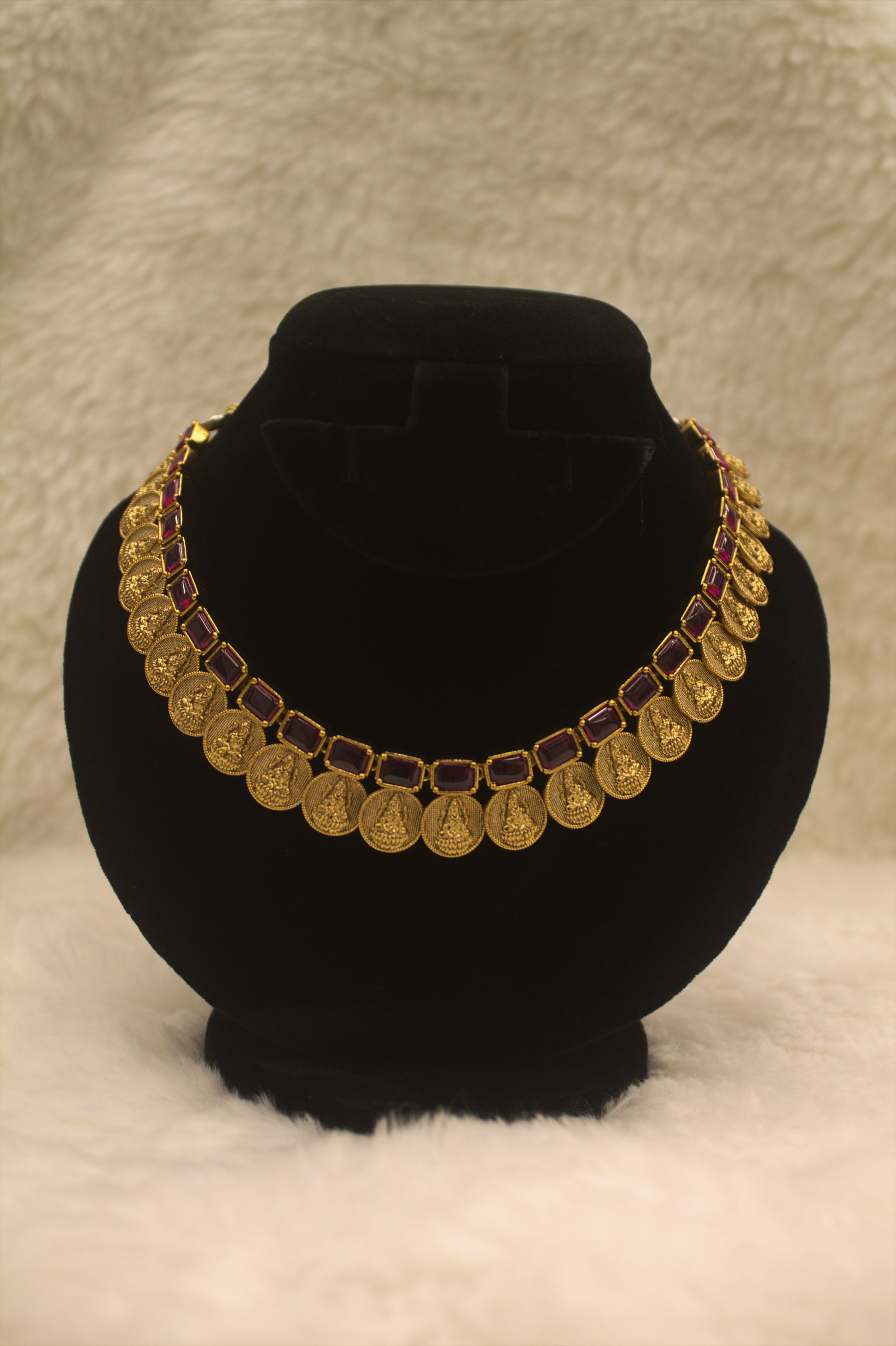 Celebrate timeless tradition with this exquisite temple coin necklace and earring set, crafted in a rich gold-finish alloy and adorned with deep purple stone accents. Each intricately detailed coin features a divine goddess motif, symbolizing prosperity and grace, making it a meaningful addition to your jewelry collection.
