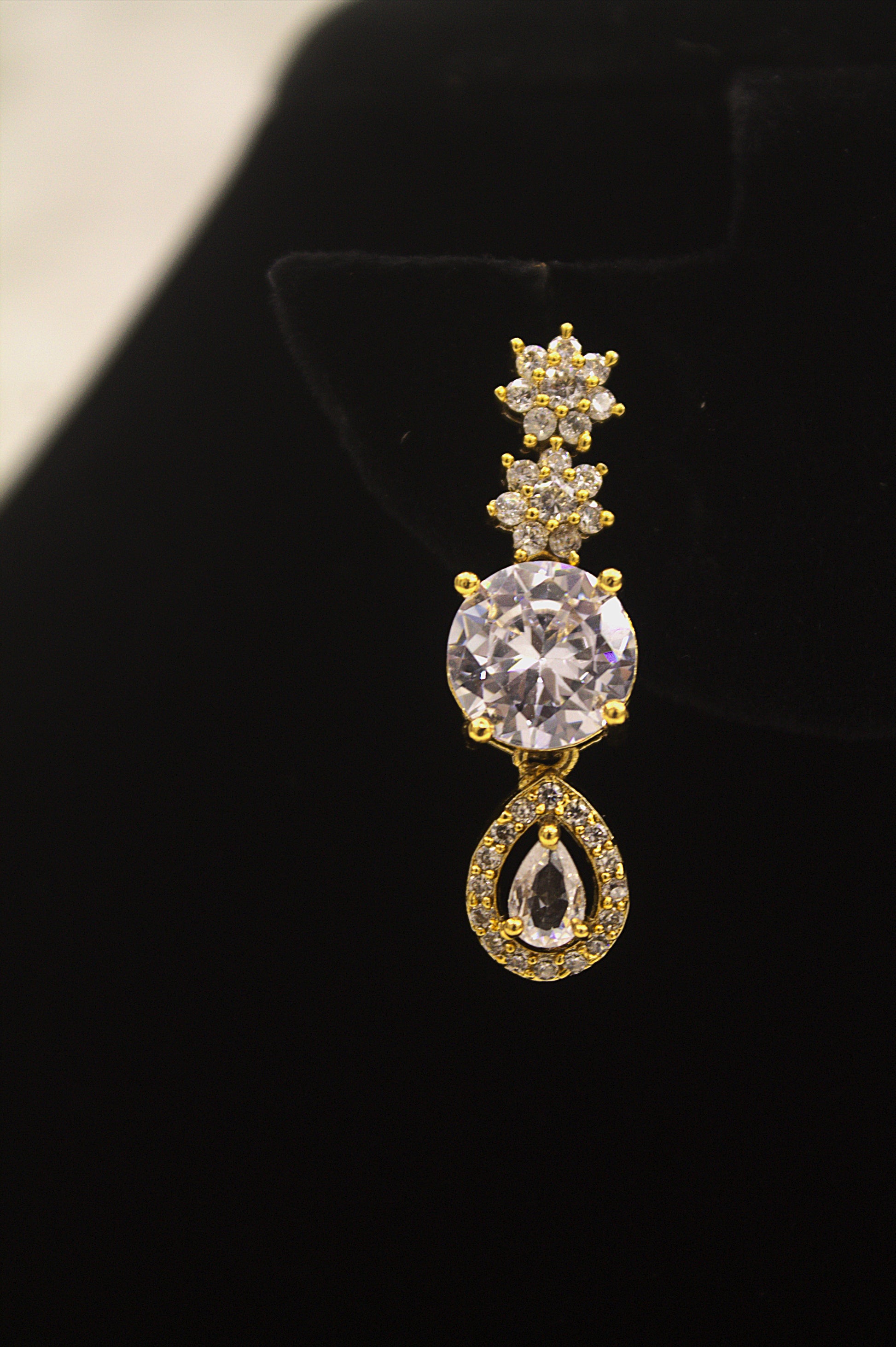 Add a touch of regal elegance to your ensemble with this gold-plated necklace and earring set, designed with a brilliant arrangement of floral motifs and dazzling zirconia stones. The centerpiece features a radiant round stone paired with a delicate teardrop accent, making it a statement piece for bridal and festive occasions.
