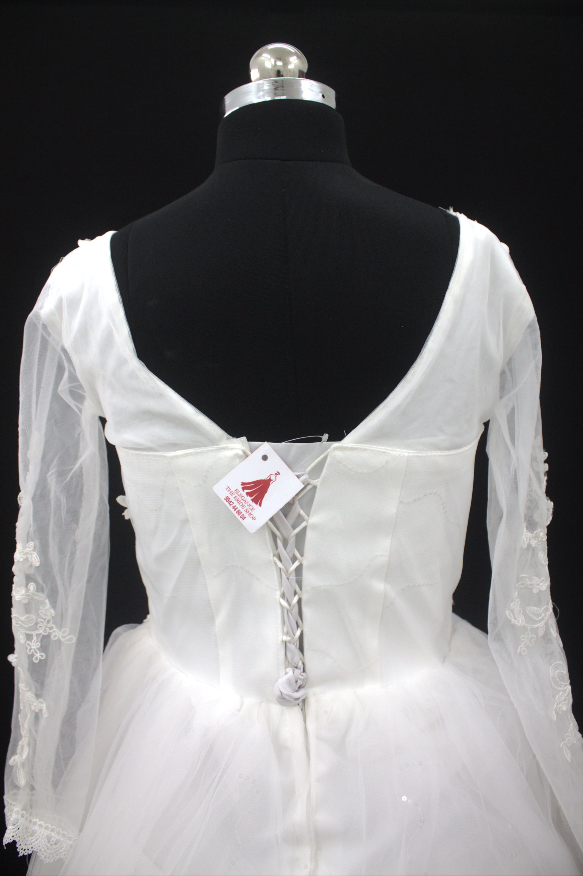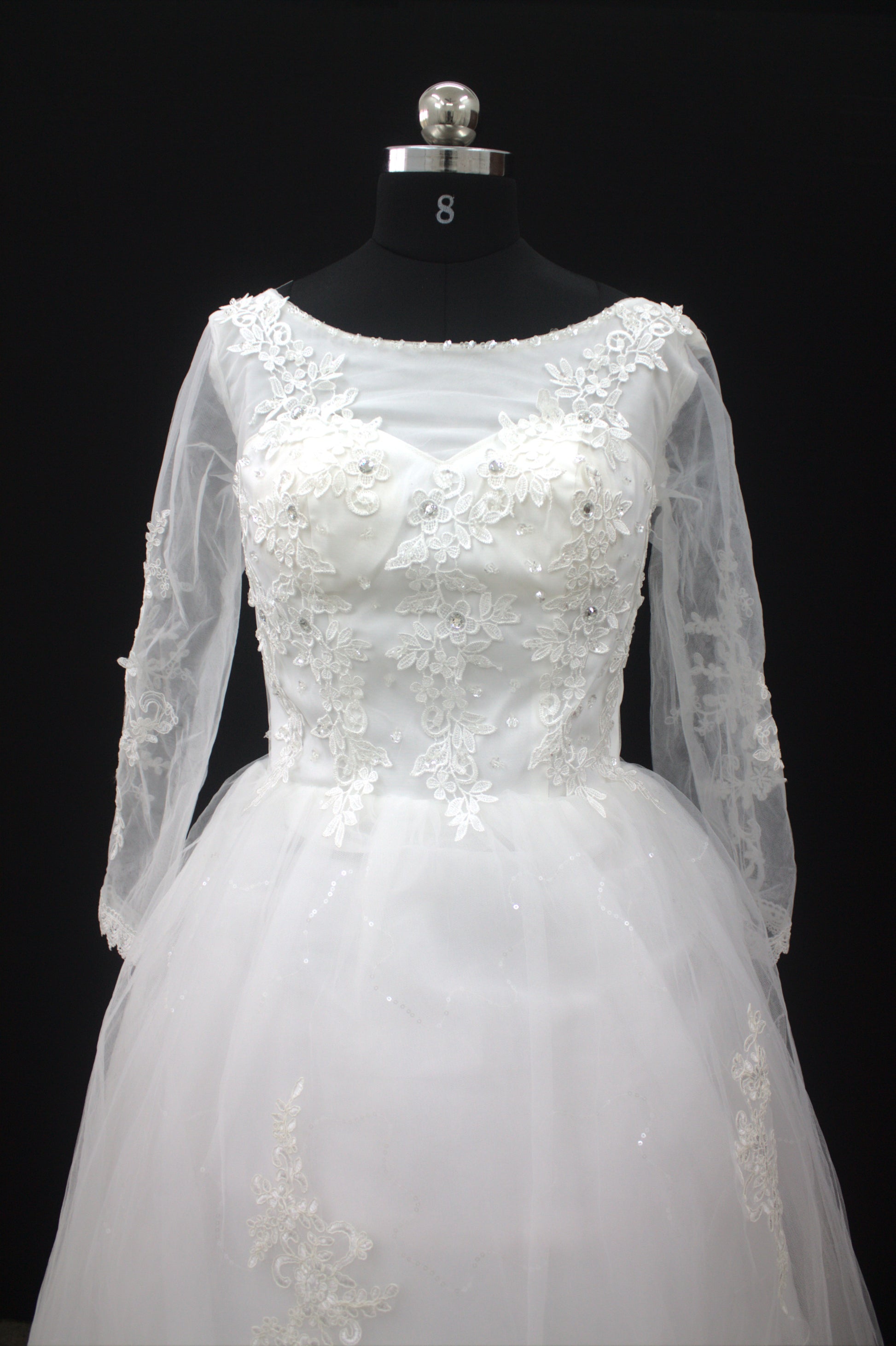 "White Beaded Tulle Ball Gown Wedding Dress with Sheer Sleeves & Lace Appliqués-White Gowns" Product code-2003