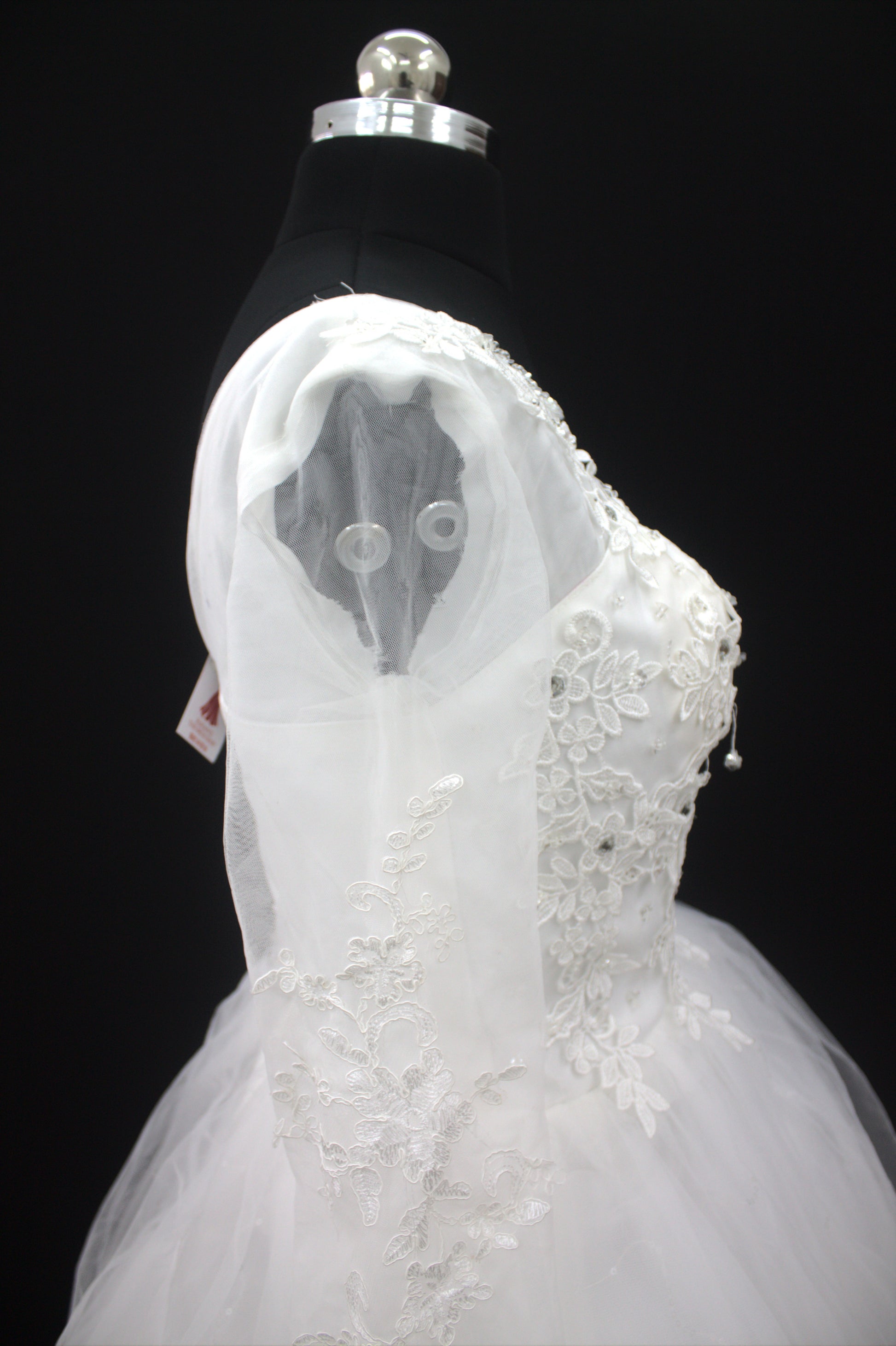 "White Beaded Tulle Ball Gown Wedding Dress with Sheer Lace Short Sleeves & Satin Waist Detail-White Gown" Product code-2019