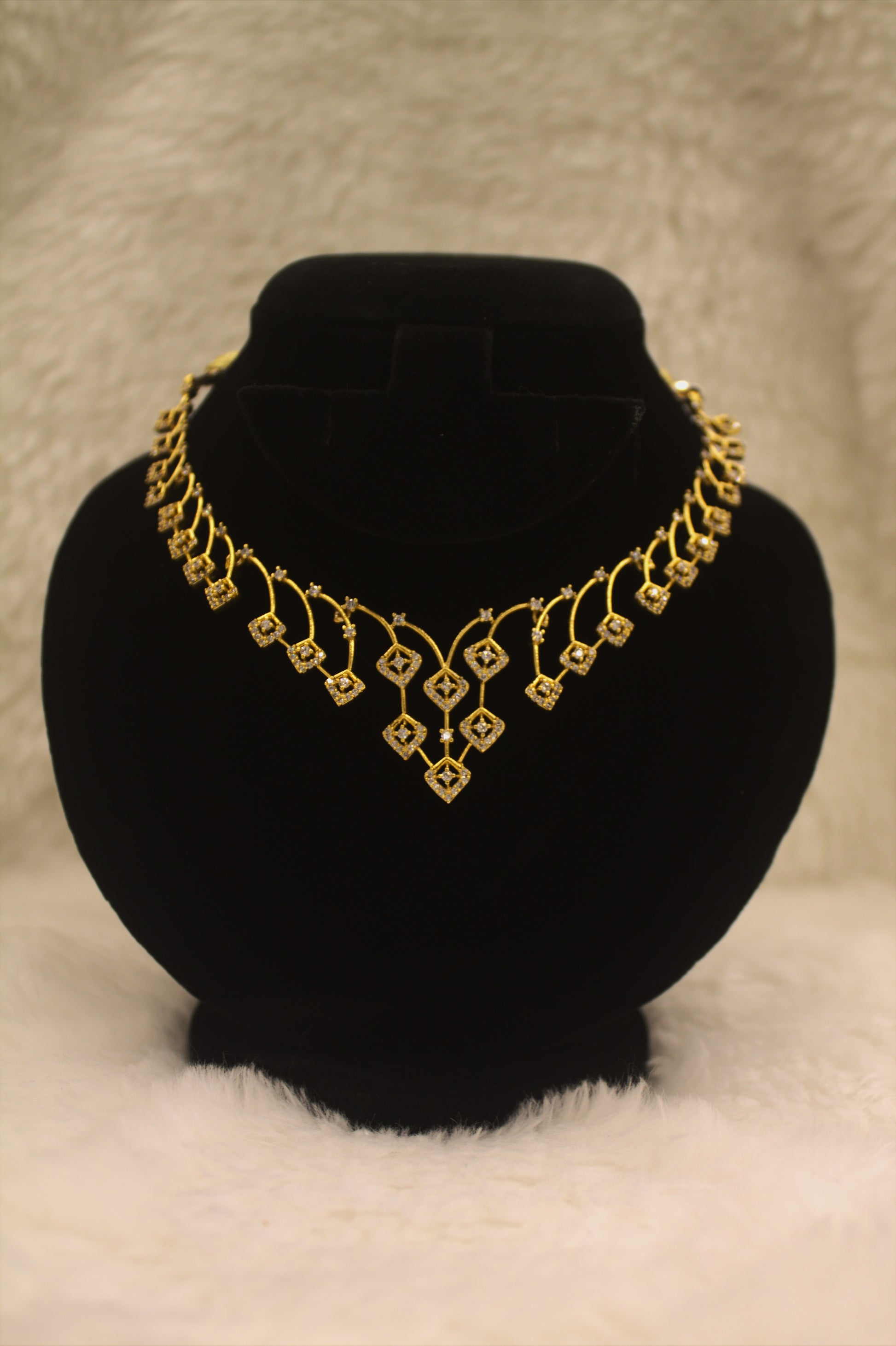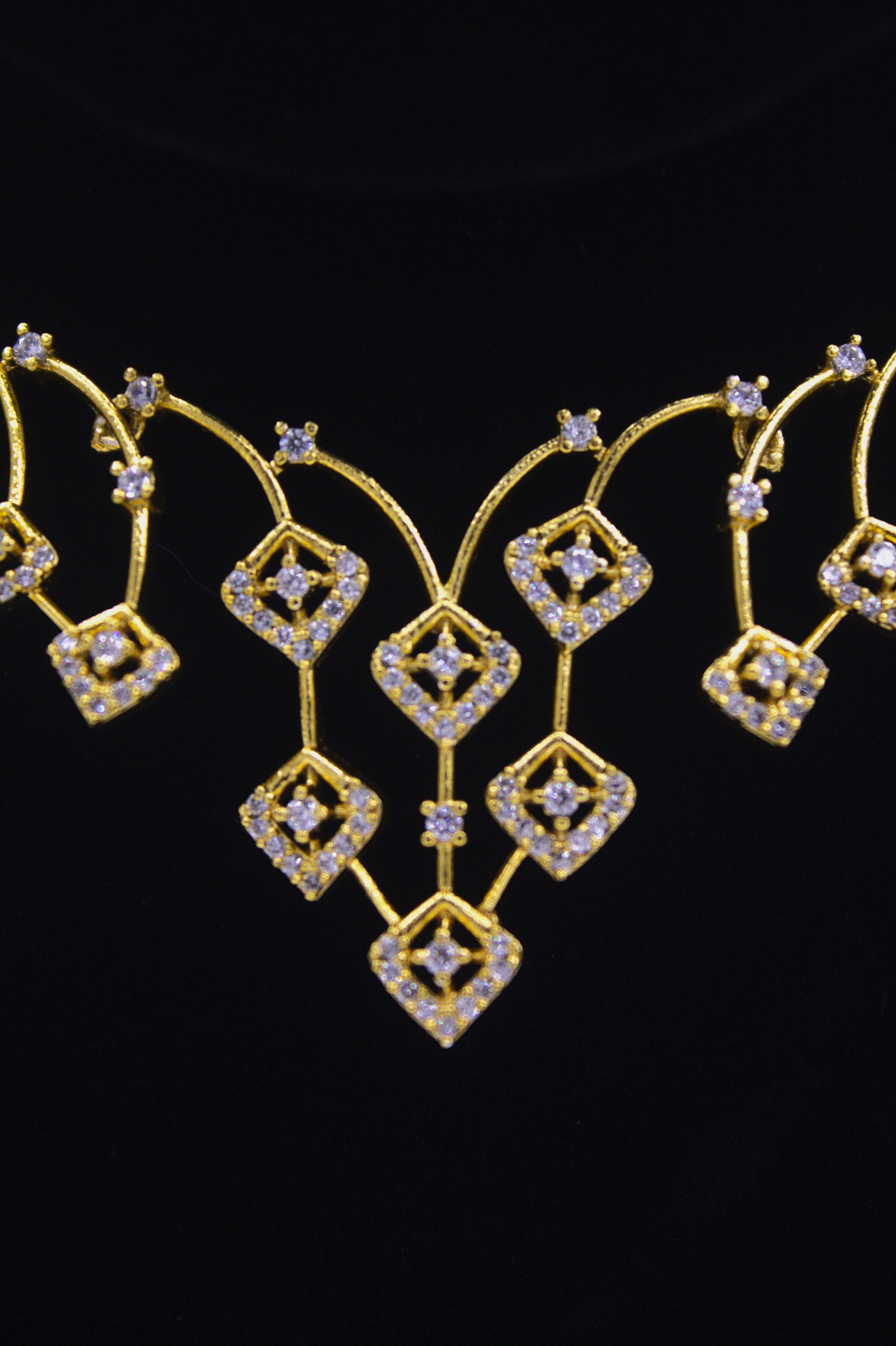 Add a touch of sophistication to your style with this gold-plated geometric necklace and earring set, adorned with sparkling cubic zirconia stones. The unique diamond-shaped motifs are intricately designed to reflect elegance and modern charm, making this set a versatile choice for both festive and formal occasions.