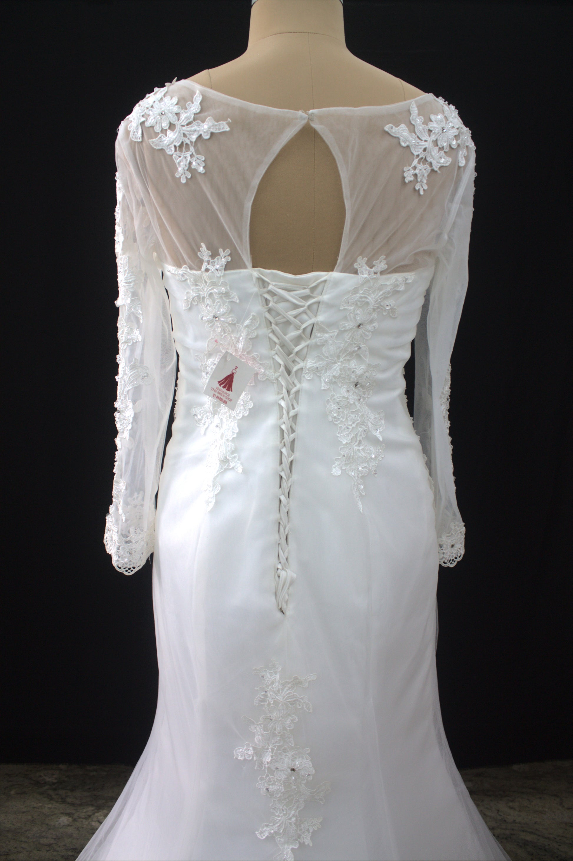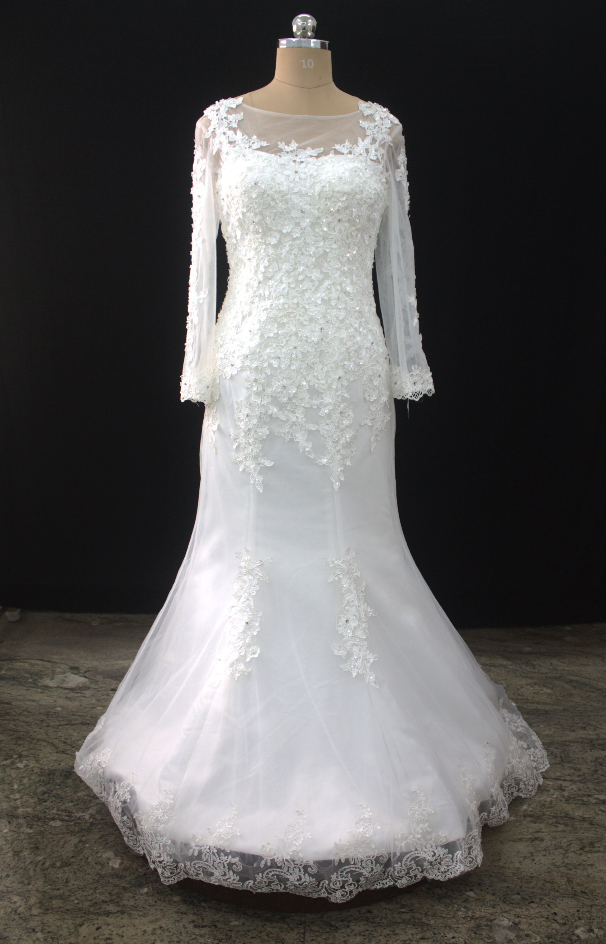 Neckline & Sleeves: Structured scoop neckline with illusion sheer long sleeves adorned with lace appliqués