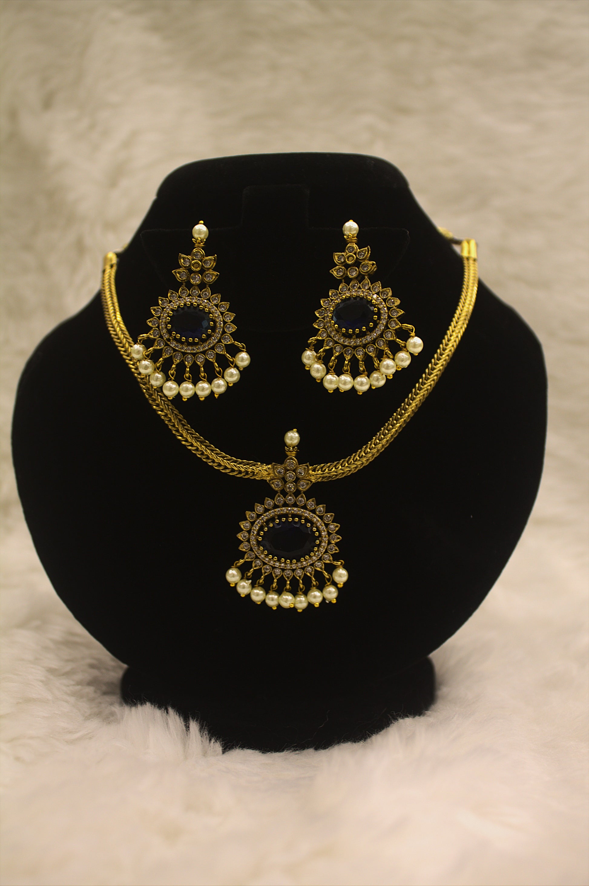 "Navy Blue Stone & Pearl Gold-Plated Necklace Set – Traditional Bridal Jewelry with Earrings" Product code-6004