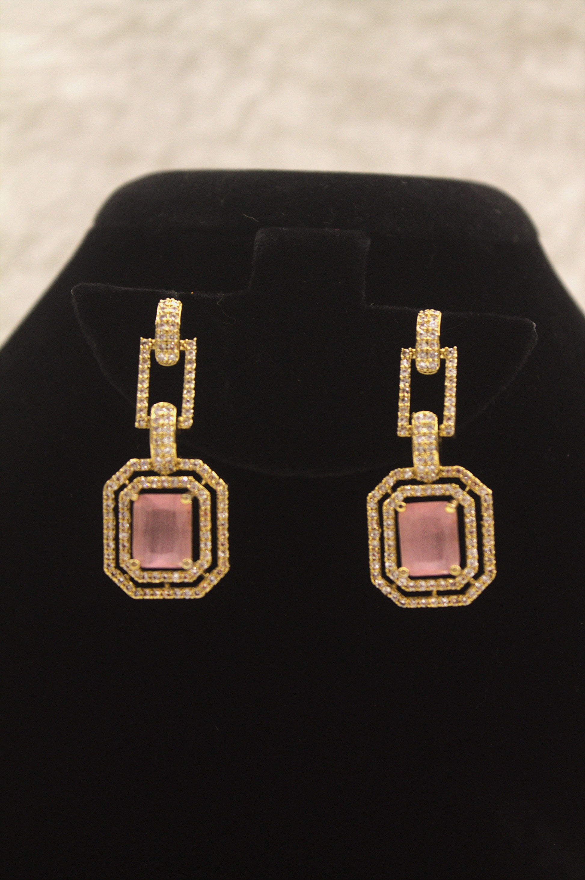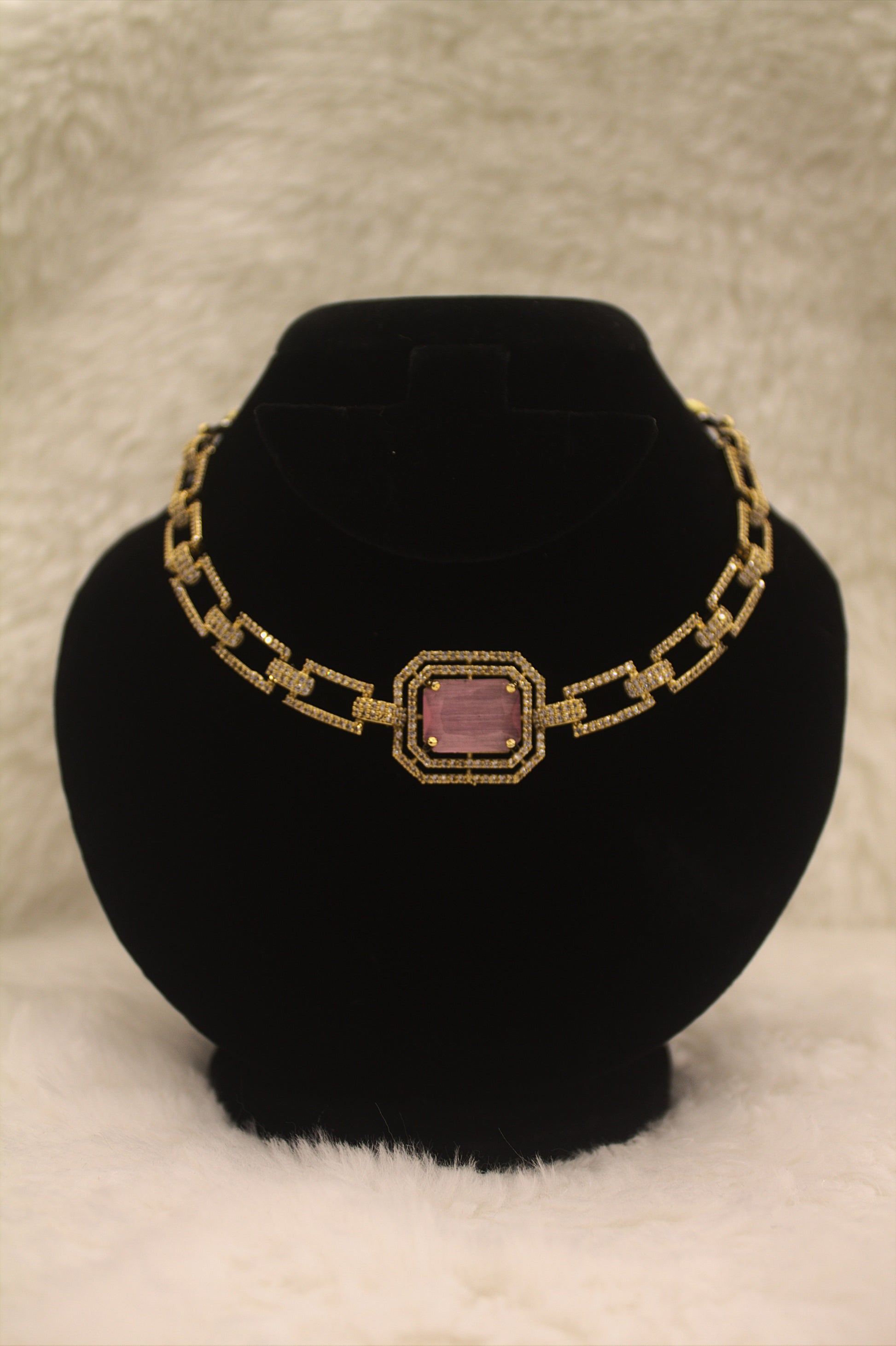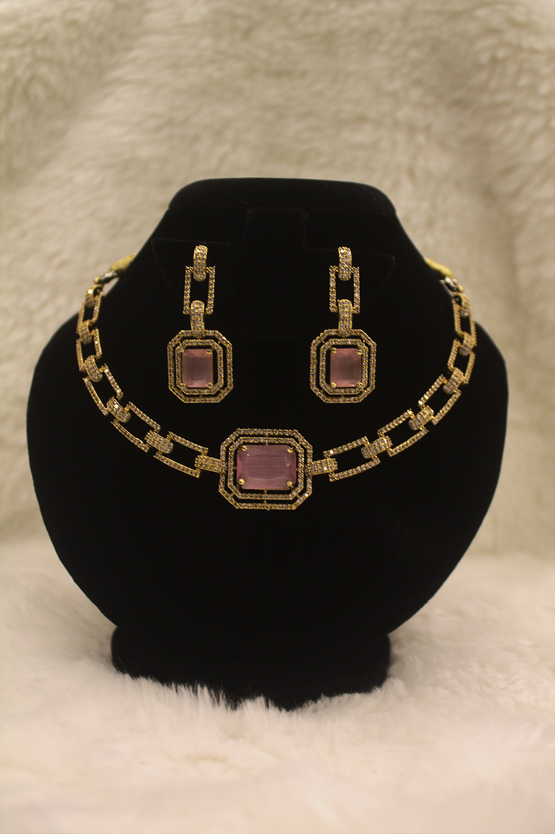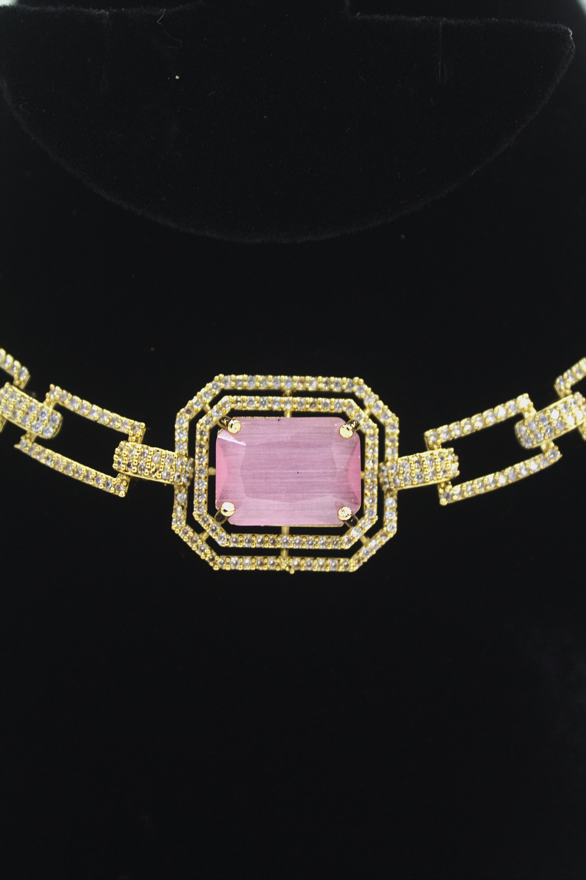 Elevate your look with this gold-plated necklace and earring set, featuring a stunning pink cubic zirconia centerpiece surrounded by shimmering crystals. Designed with bold geometric links, this set strikes the perfect balance between modern luxury and timeless elegance, making it ideal for special occasions.