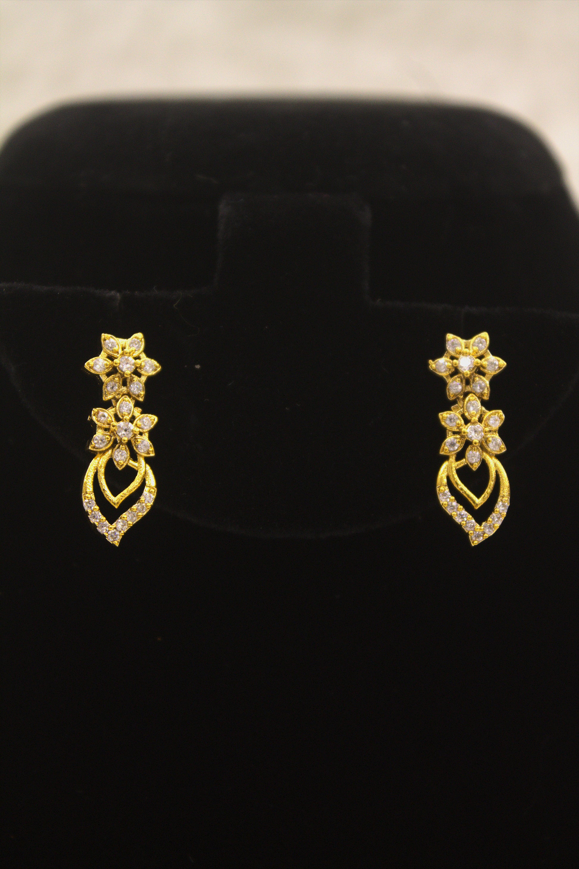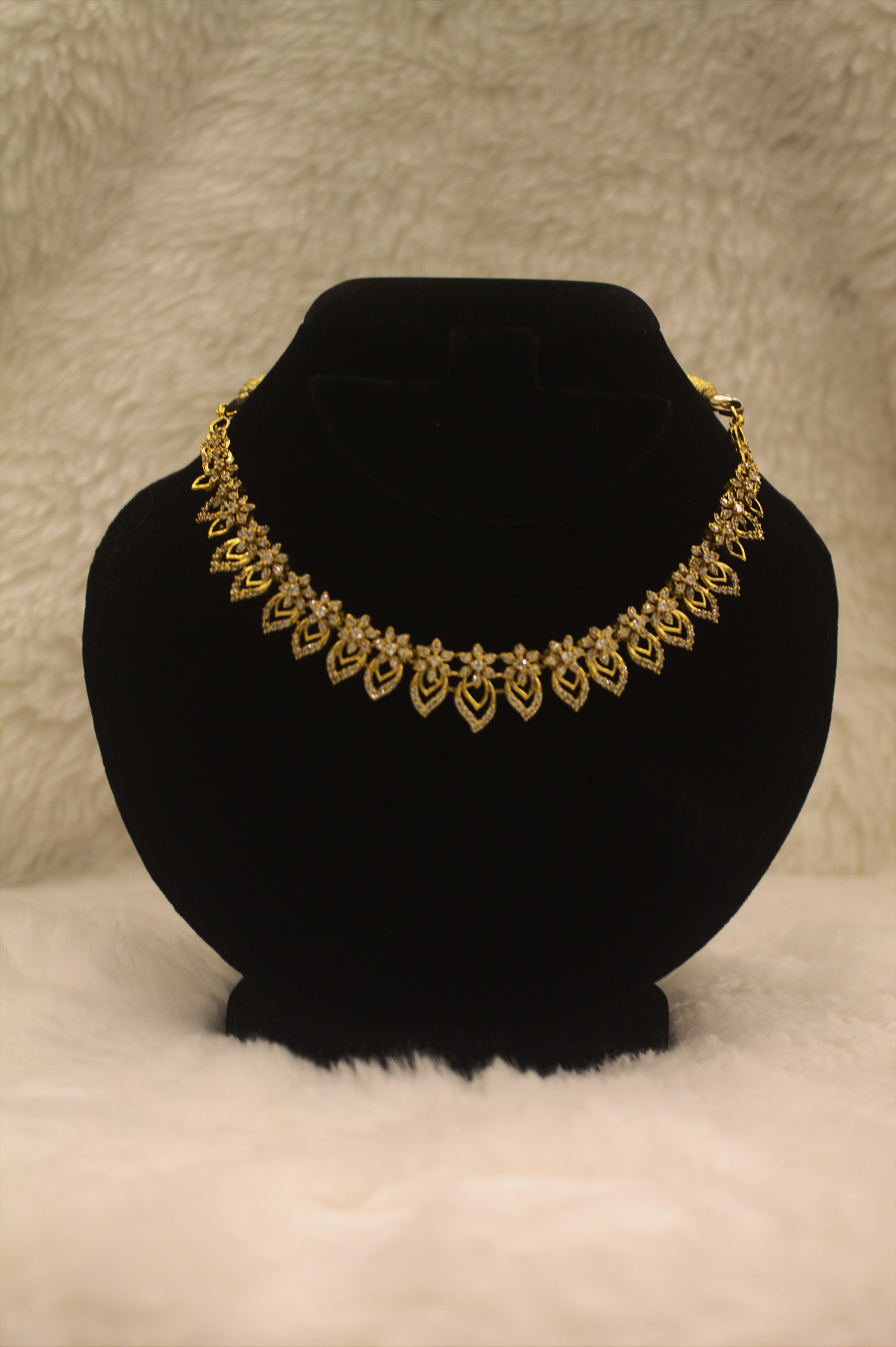 Elevate your look with this floral-inspired gold-plated necklace and earring set, crafted with precision and adorned with dazzling cubic zirconia stones. The intricate flower motifs paired with drop-shaped designs exude timeless beauty, making it a versatile accessory for weddings, festive occasions, and elegant evenings.
