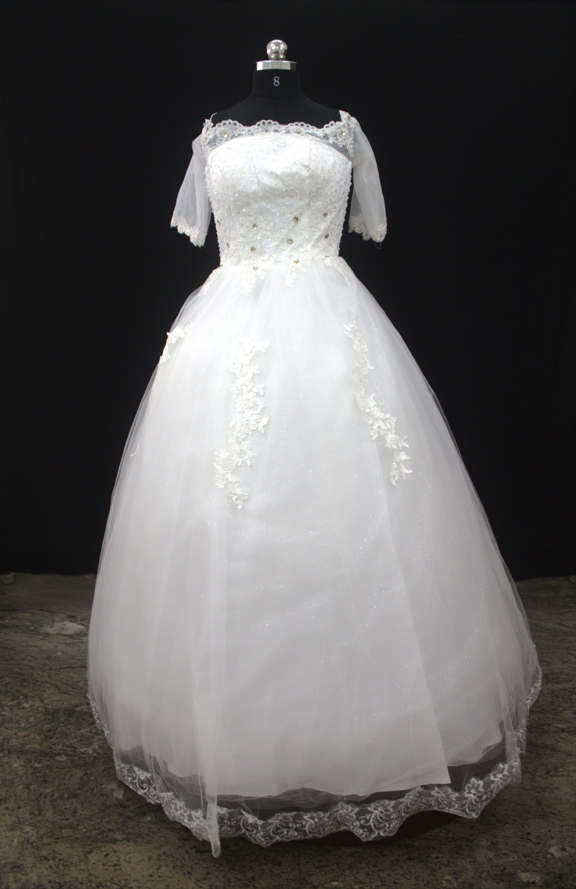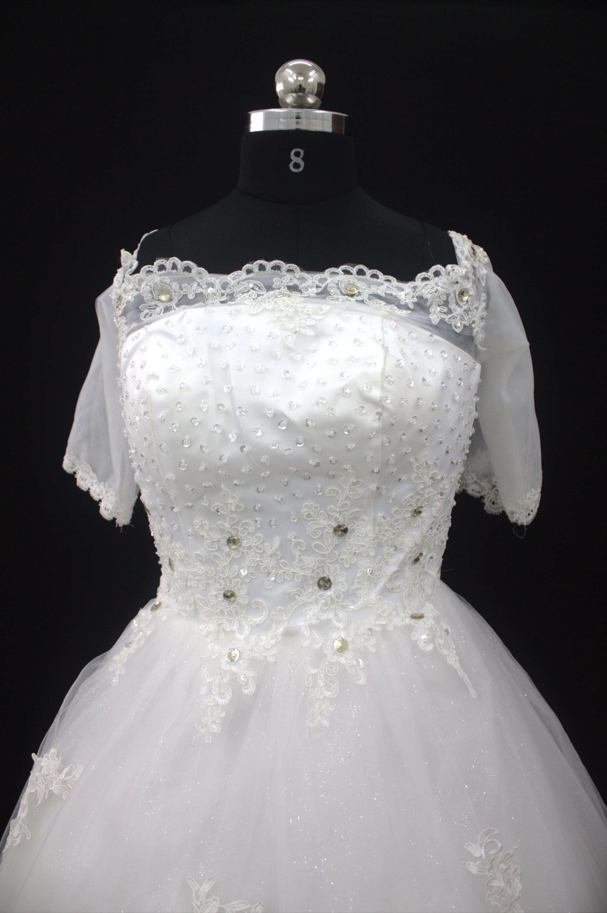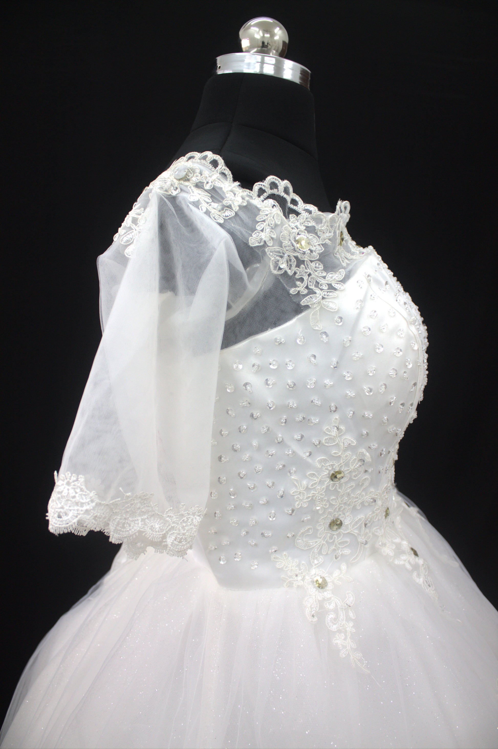 "White Beaded Tulle Ball Gown Wedding Dress with Sheer Lace Short Sleeves & Satin Waist Detail-White Gown" Product code-2019