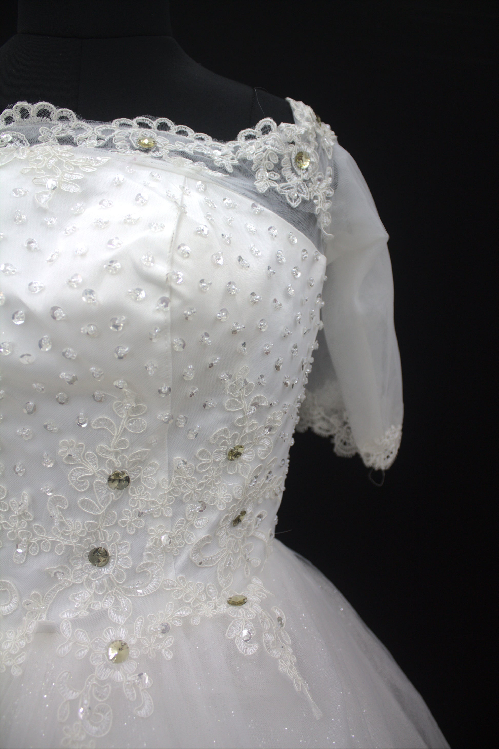 ✔ Beaded and lace appliqué bodice for intricate detail
